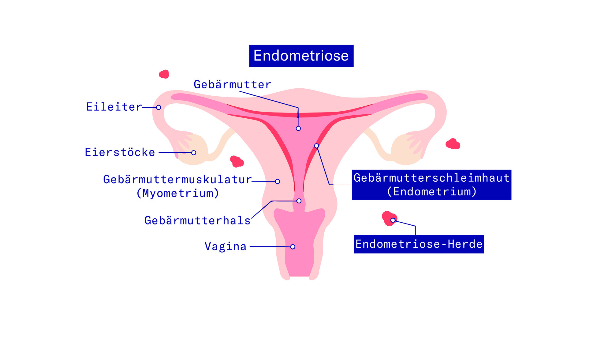 Neben Gebärmutter, Eierstöcken, Beckenraum, Vagina und Bauchfell, der eben genannten Blase und des Magen-Darm-Trakts können also auch andere Lokalisationen wie Bauchnabel, Harnleiter, Lunge, Zwerchfell, Gehirn und Narben betroffen sein [1, 3, 4].